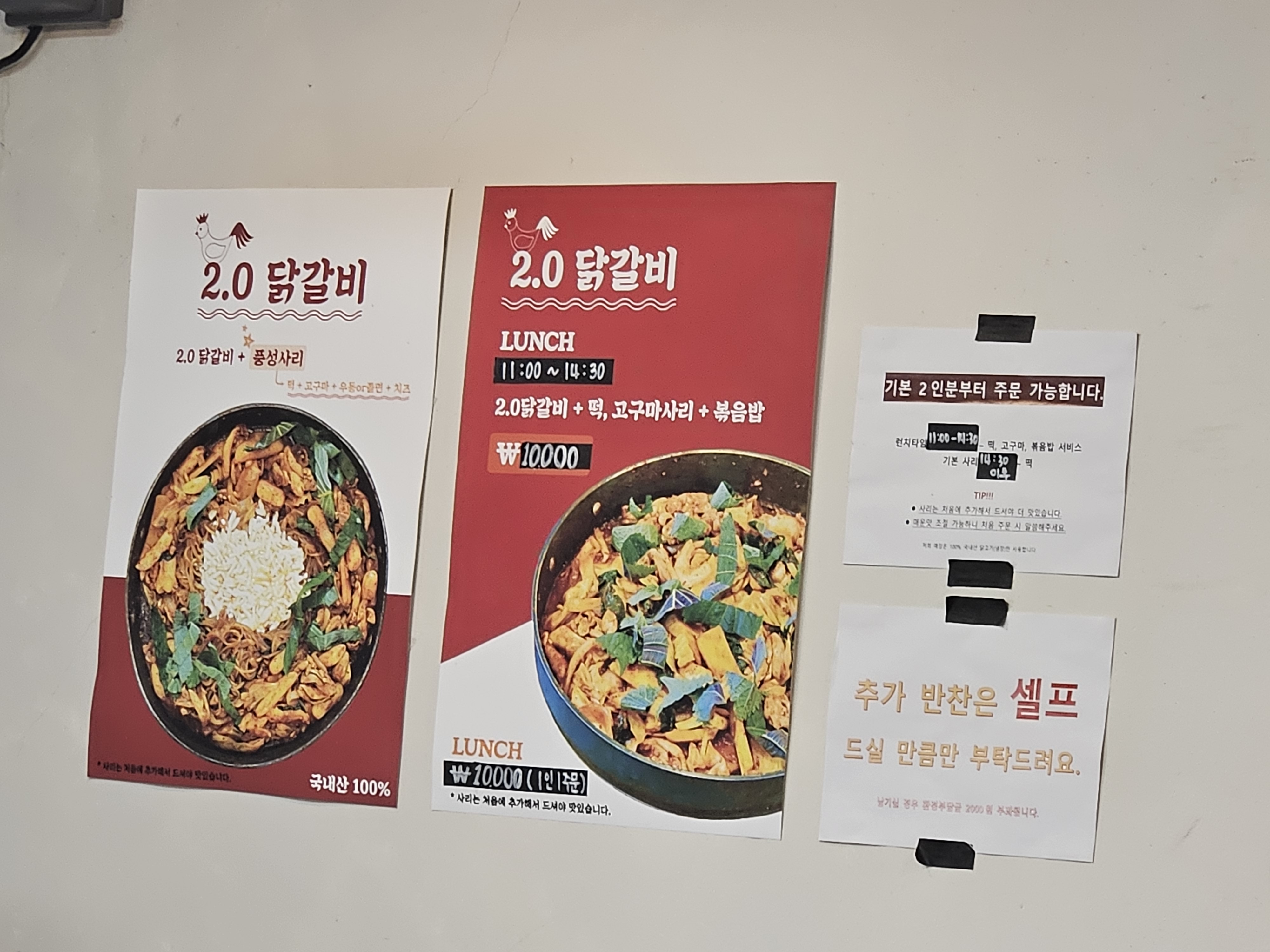메뉴판은 이렇게 있었는데요 점심시간에 방문했어서 2.0닭갈비 런치세트를 주문해 2.0닭갈비 + 떡,고구마사리+볶음밥