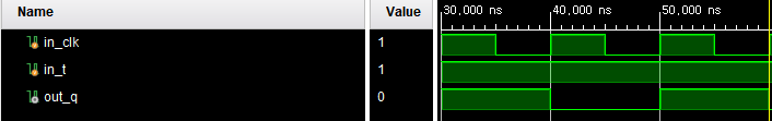 T FlipFlop의 out_q의 초기값을 1로 주었기때문에 초기값은 1이나왔고 0후에 1로 토글이 된것으로보아 회로구성이 잘되었다는 것을 알 수 있습니다.